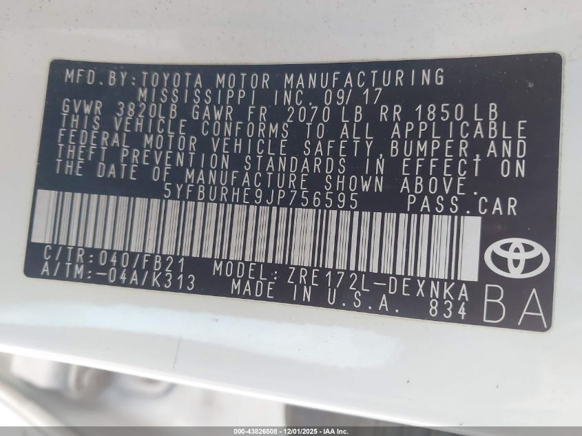2018 TOYOTA COROLLA 2018 року Бензин, 1.8, Передний привод, vin - 5YFBURHE9JP756595 из США