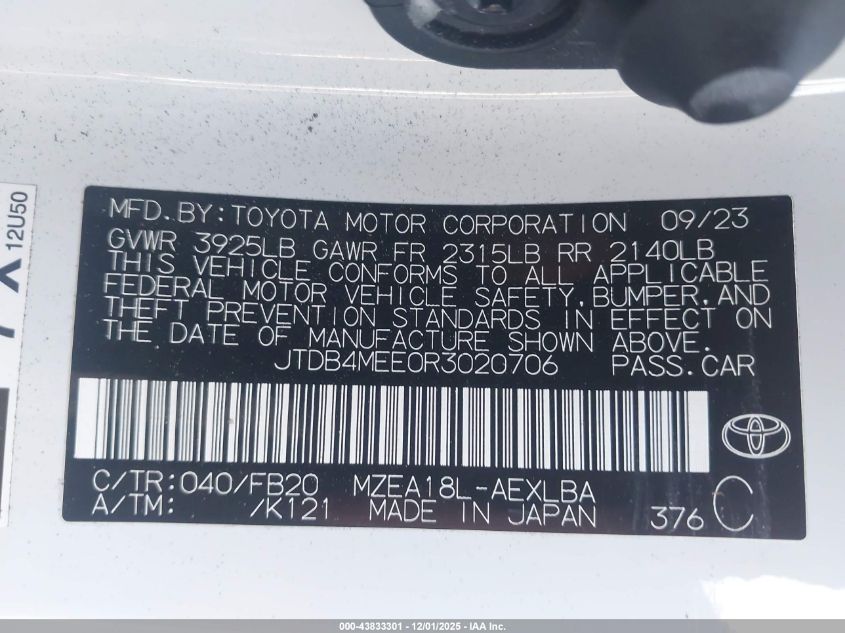 2024 TOYOTA COROLLA 2024 року Бензин, 2.0, Передний привод, vin - JTDB4MEE0R3020706 из США