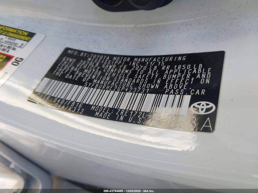 2016 TOYOTA COROLLA 2016 року Бензин, 1.8, Передний привод, vin - 5YFBURHE2GP423731 из США