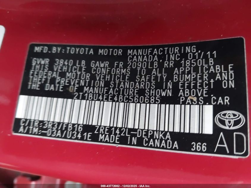 2011 TOYOTA COROLLA 2011 року Бензин, 1.8, Передний привод, vin - 2T1BU4EE4BC560685 из США
