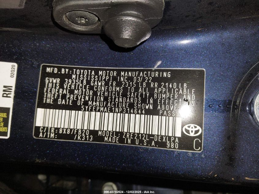 2022 TOYOTA COROLLA 2022 року Бензин, 1.8, Передний привод, vin - 5YFEPMAE1NP314644 из США