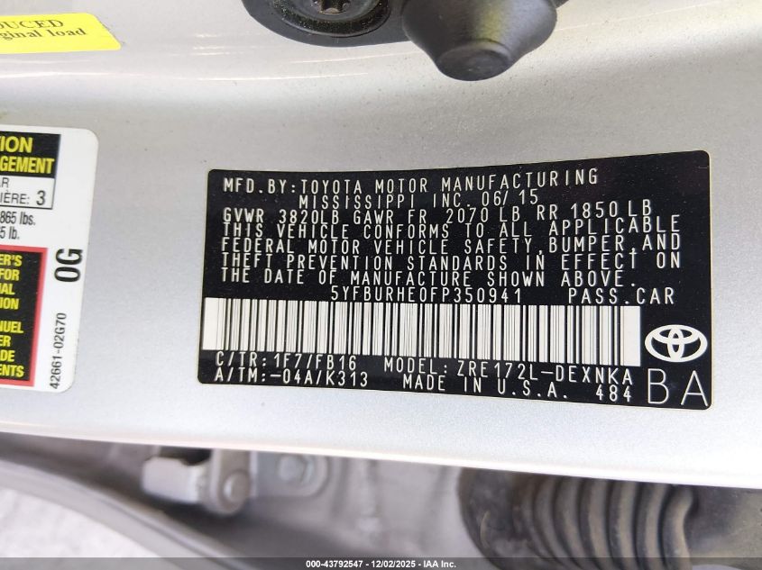 2015 TOYOTA COROLLA 2015 року Бензин, 1.8, Передний привод, vin - 5YFBURHE0FP350941 из США