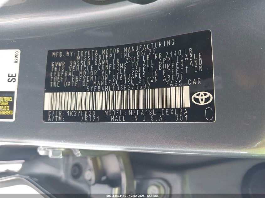 2025 TOYOTA COROLLA 2025 року Бензин, 2.0, Передний привод, vin - 5YFB4MDE3SP273582 из США