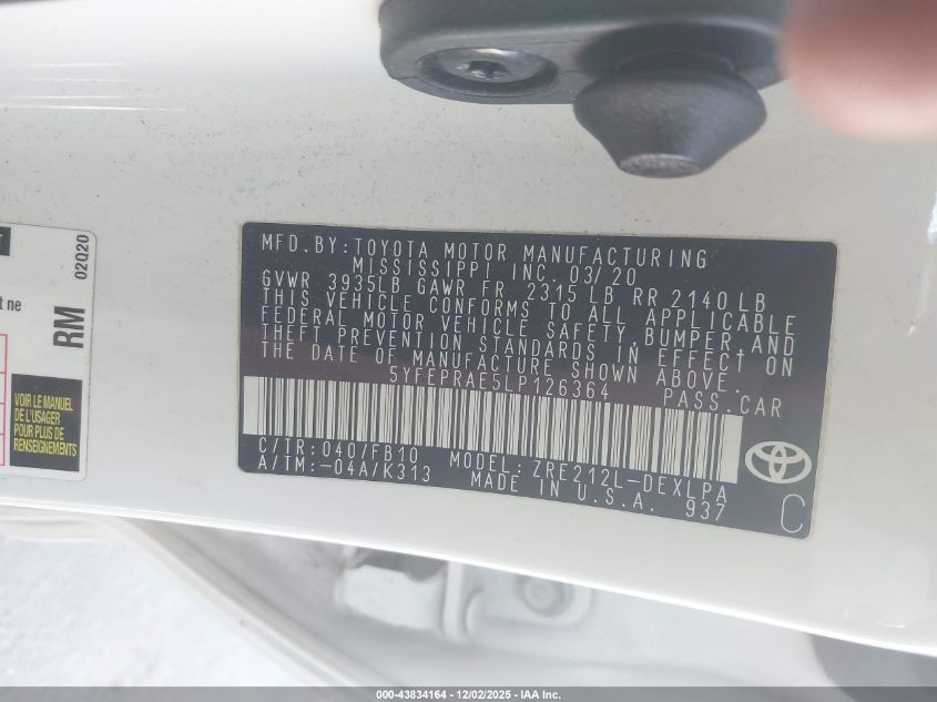 2020 TOYOTA COROLLA 2020 року Бензин, 1.8, Передний привод, vin - 5YFEPRAE5LP126364 из США