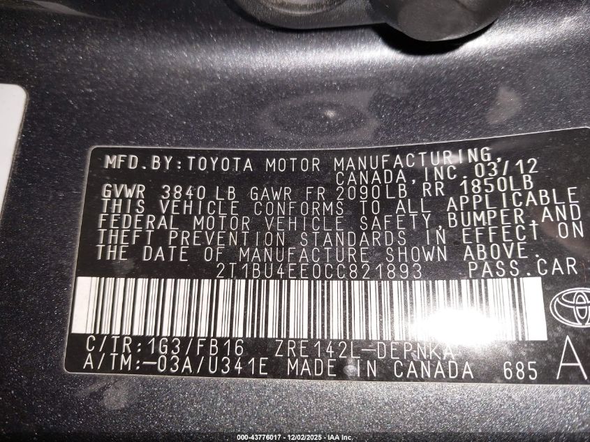2012 TOYOTA COROLLA 2012 року Бензин, 1.8, Передний привод, vin - 2T1BU4EE0CC821893 из США