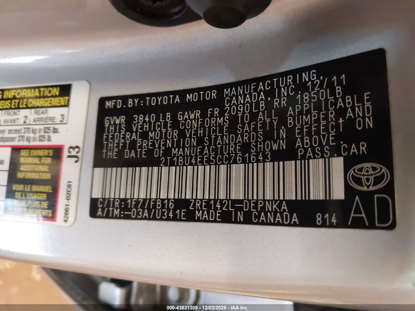 2012 TOYOTA COROLLA 2012 року Бензин, 1.8, Передний привод, vin - 2T1BU4EE5CC761643 из США