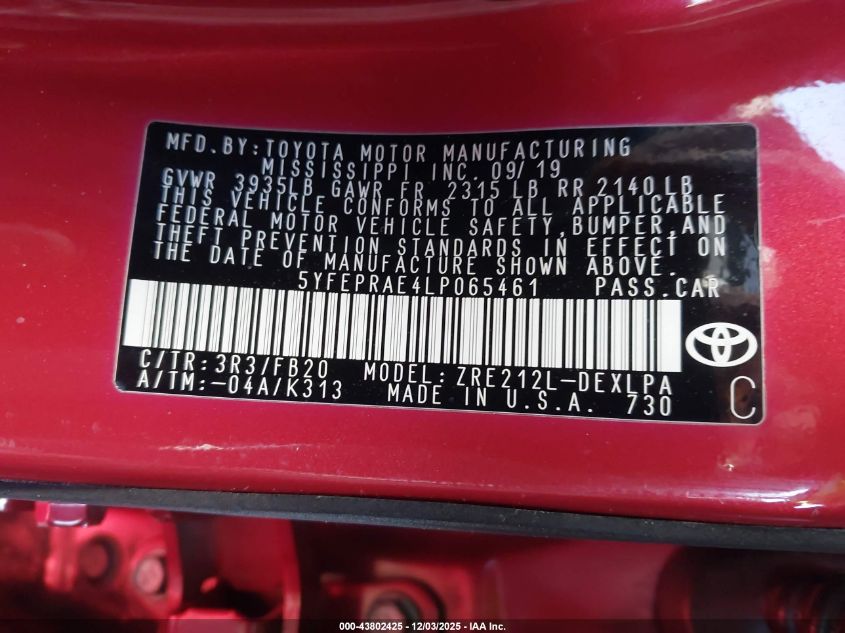 2020 TOYOTA COROLLA 2020 року Бензин, 1.8, Передний привод, vin - 5YFEPRAE4LP065461 из США