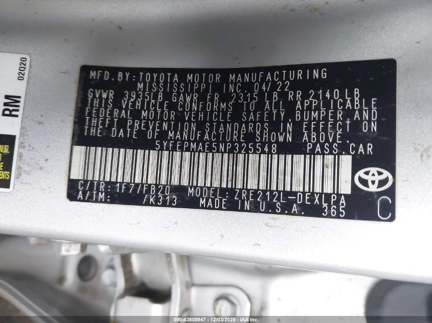 2022 TOYOTA COROLLA 2022 року Бензин, 1.8, Передний привод, vin - 5YFEPMAE5NP325548 из США