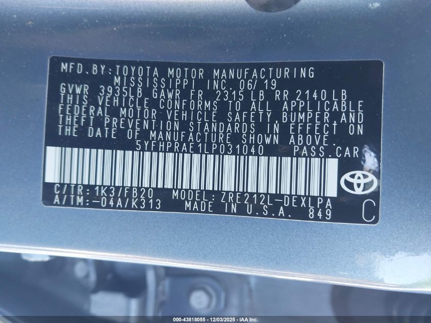 2020 TOYOTA COROLLA 2020 року Бензин, 1.8, Передний привод, vin - 5YFHPRAE1LP031040 из США