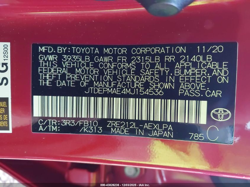 2021 TOYOTA COROLLA 2021 року Бензин, 1.8, Передний привод, vin - JTDEPMAE4MJ154536 из США