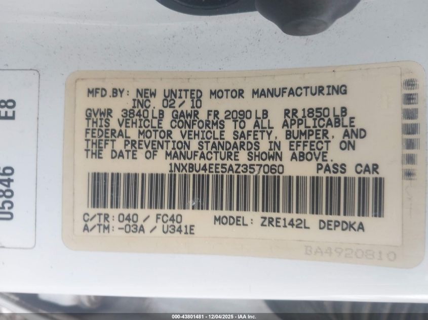 2010 TOYOTA COROLLA 2010 року Бензин, 1.8, Передний привод, vin - 1NXBU4EE5AZ357060 из США