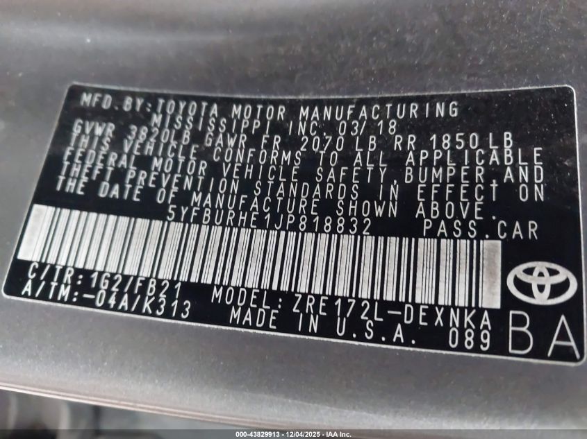 2018 TOYOTA COROLLA 2018 року Бензин, 1.8, Передний привод, vin - 5YFBURHE1JP818832 из США