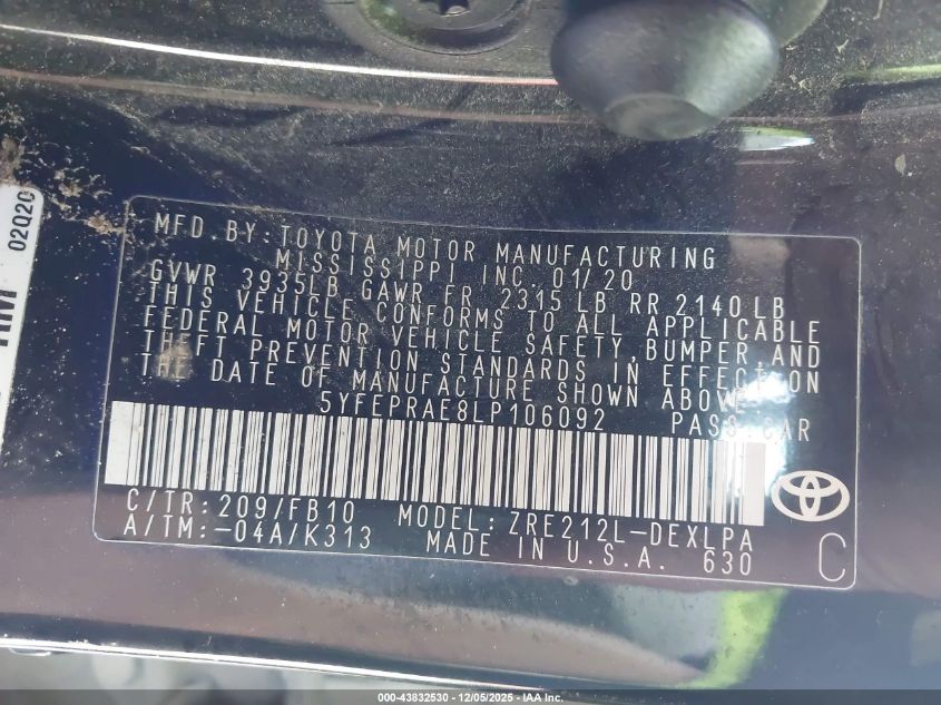 2020 TOYOTA COROLLA 2020 року Бензин, 1.8, Передний привод, vin - 5YFEPRAE8LP106092 из США