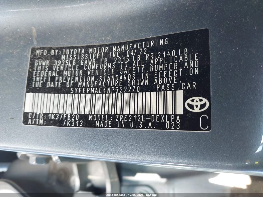2022 TOYOTA COROLLA 2022 року Бензин, 1.8, Передний привод, vin - 5YFEPMAE4NP322270 из США