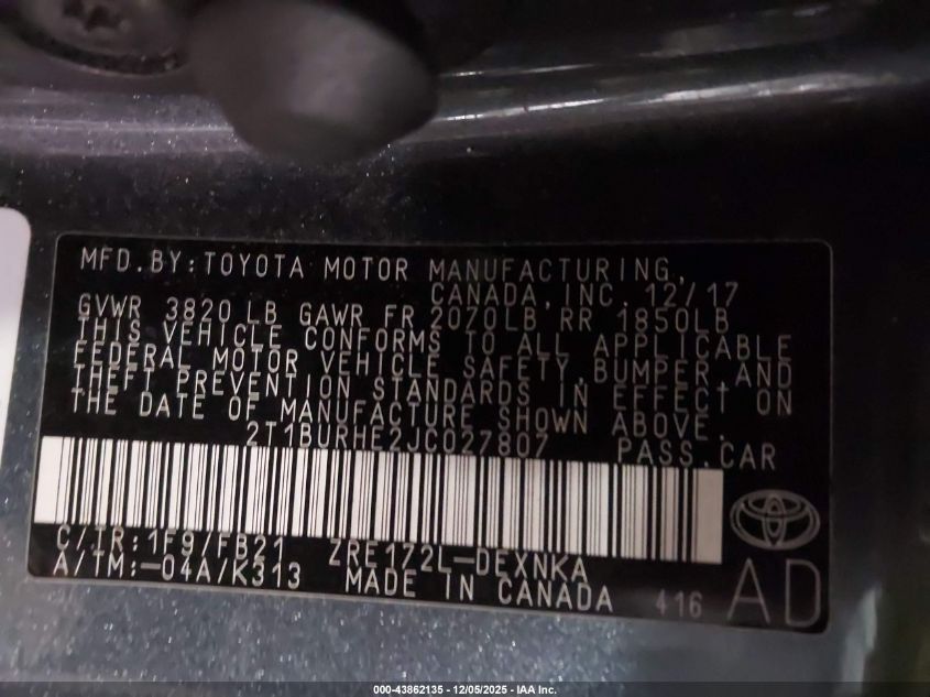 2018 TOYOTA COROLLA 2018 року Бензин, 1.8, Передний привод, vin - 2T1BURHE2JC027807 из США