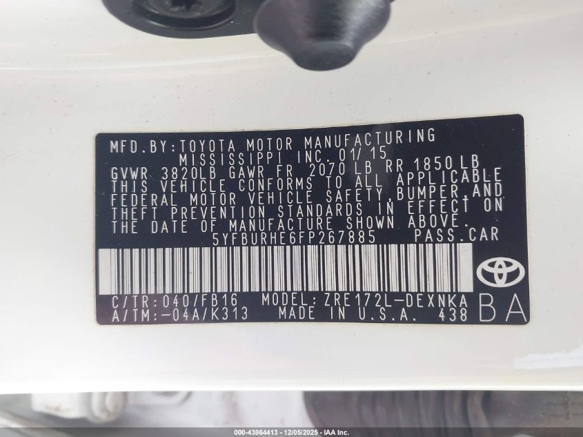 2015 TOYOTA COROLLA 2015 року Бензин, 1.8, Передний привод, vin - 5YFBURHE6FP267885 из США