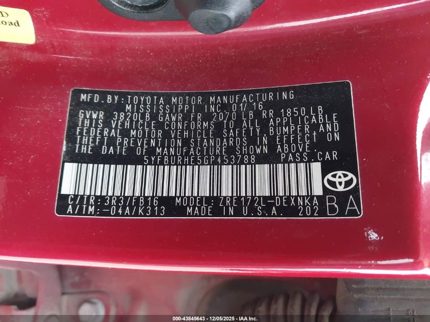 2016 TOYOTA COROLLA 2016 року Бензин, 1.8, Передний привод, vin - 5YFBURHE5GP453788 из США