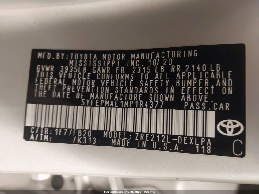 2021 TOYOTA COROLLA 2021 року Бензин, 1.8, Передний привод, vin - 5YFEPMAE1MP184377 из США
