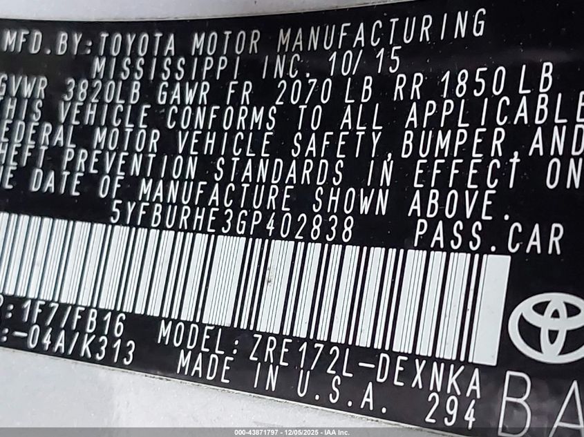 2016 TOYOTA COROLLA 2016 року Бензин, 1.8, Передний привод, vin - 5YFBURHE3GP402838 из США