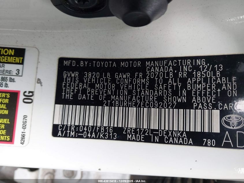 2014 TOYOTA COROLLA 2014 року Бензин, 1.8, Передний привод, vin - 2T1BURHE7EC092027 из США