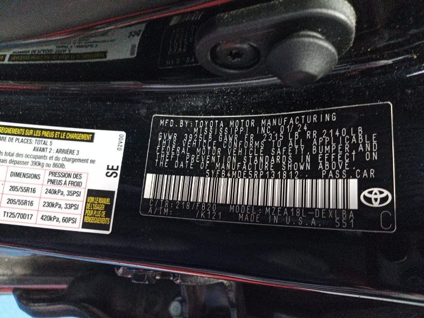 2024 TOYOTA COROLLA 2024 року Бензин, 2.0, Передний привод, vin - 5YFB4MDE5RP131812 из США