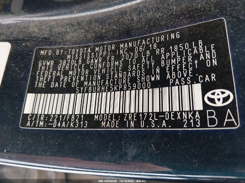 2019 TOYOTA COROLLA 2019 року Бензин, 1.8, Передний привод, vin - 5YFBURHE5KP859000 из США