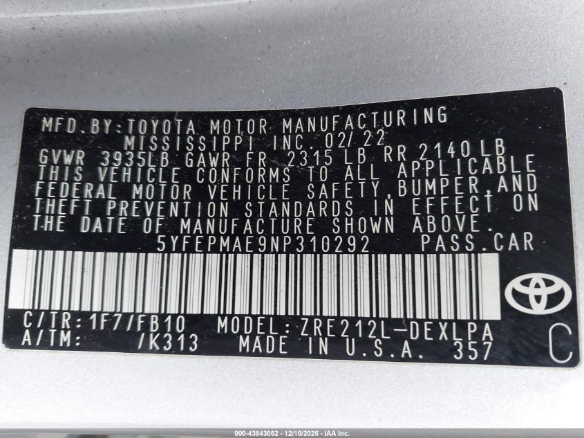2022 TOYOTA COROLLA 2022 року Бензин, 1.8, Передний привод, vin - 5YFEPMAE9NP310292 из США