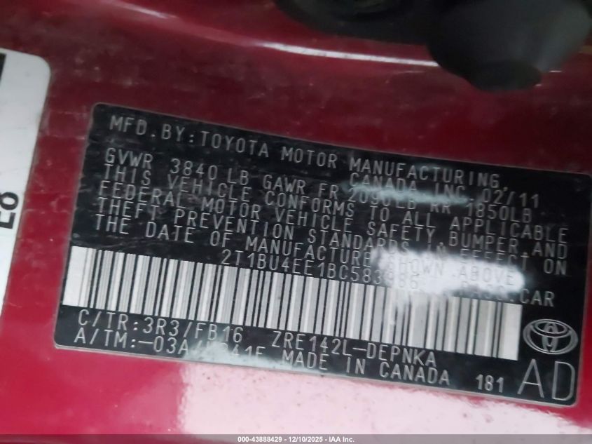 2011 TOYOTA COROLLA 2011 року Бензин, 1.8, Передний привод, vin - 2T1BU4EE1BC583986 из США