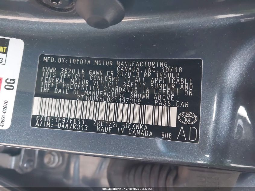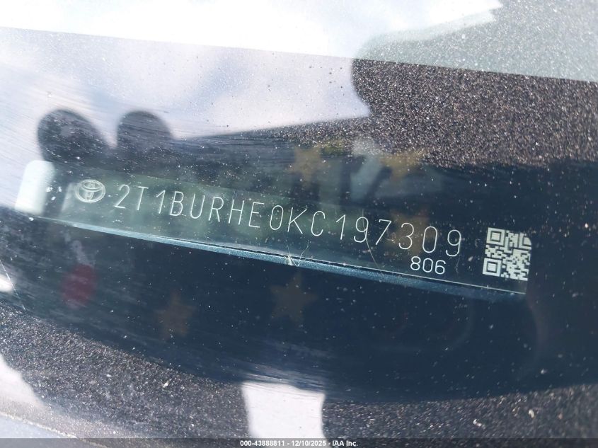 2019 TOYOTA COROLLA 2019 року Бензин, 1.8, Передний привод, vin - 2T1BURHE0KC197309 из США