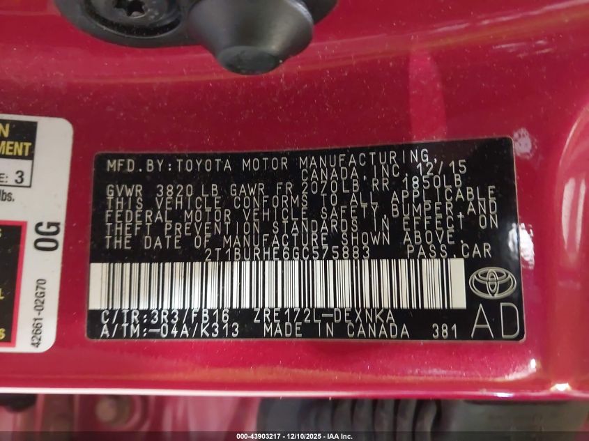 2016 TOYOTA COROLLA 2016 року Бензин, 1.8, Передний привод, vin - 2T1BURHE6GC575883 из США