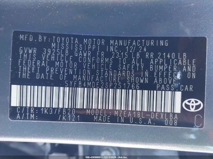2025 TOYOTA COROLLA 2025 року Бензин, 2.0, Передний привод, vin - 5YFB4MDE2SP251766 из США