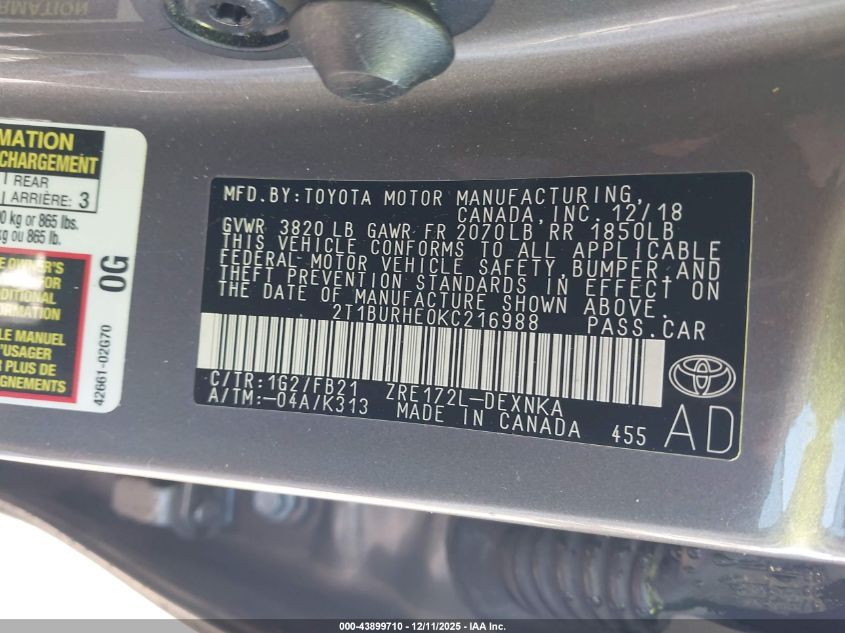 2019 TOYOTA COROLLA 2019 року Бензин, 1.8, Передний привод, vin - 2T1BURHE0KC216988 из США
