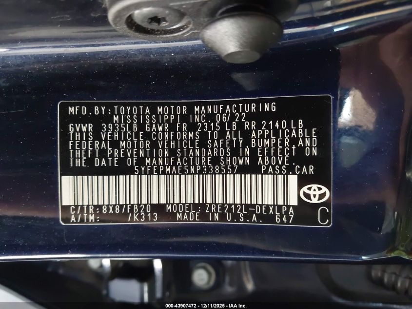 2022 TOYOTA COROLLA 2022 року Бензин, 1.8, Передний привод, vin - 5YFEPMAE5NP338557 из США