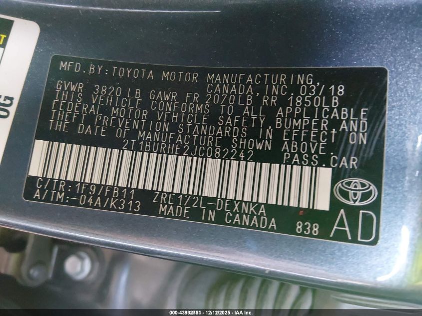 2018 TOYOTA COROLLA 2018 року Бензин, 1.8, Передний привод, vin - 2T1BURHE2JC082242 из США