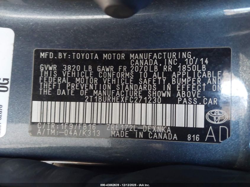 2015 TOYOTA COROLLA 2015 року Бензин, 1.8, Передний привод, vin - 2T1BURHEXFC271230 из США