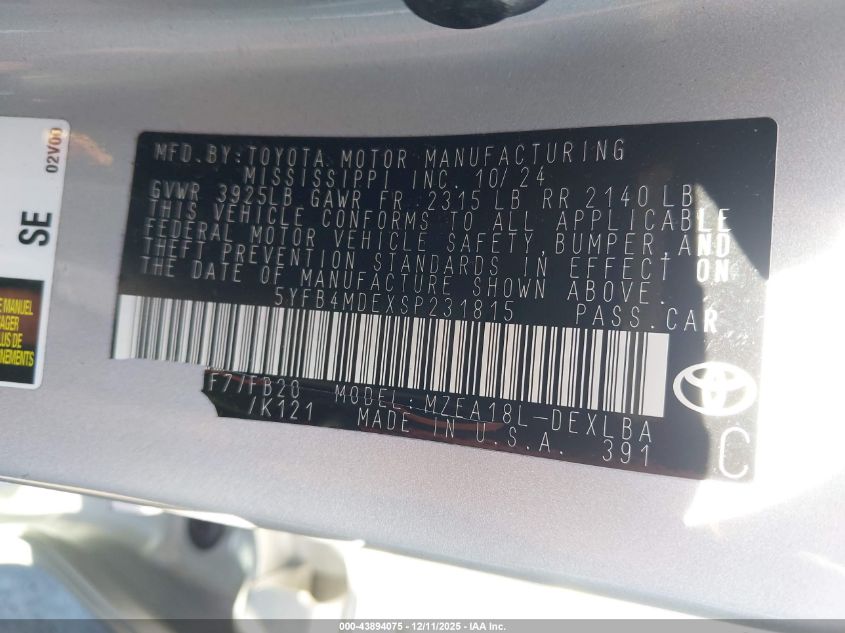 2025 TOYOTA COROLLA 2025 року Бензин, 2.0, Передний привод, vin - 5YFB4MDEXSP231815 из США