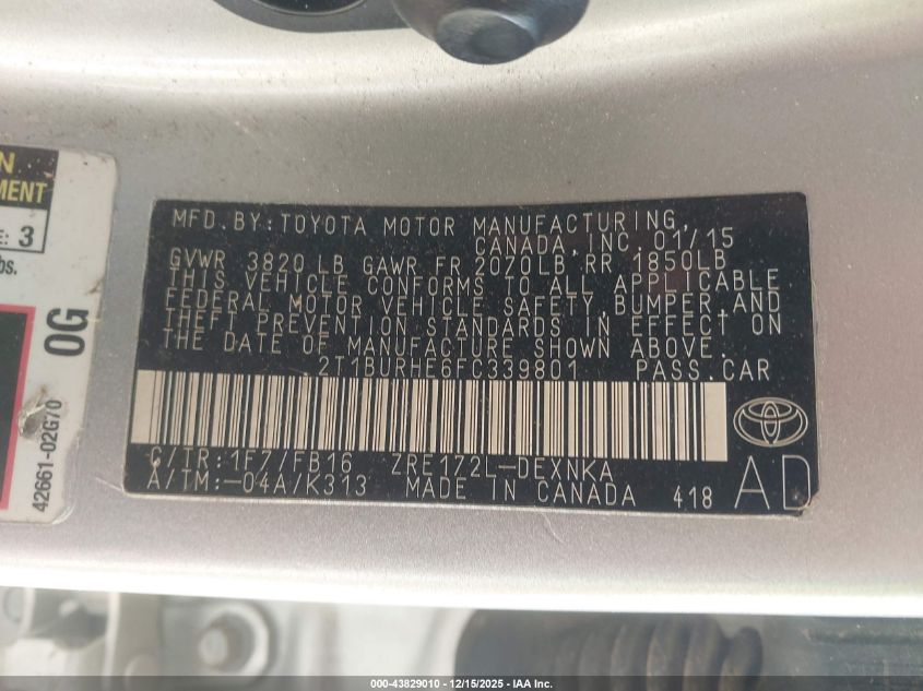 2015 TOYOTA COROLLA 2015 року Бензин, 1.8, Передний привод, vin - 2T1BURHE6FC339801 из США