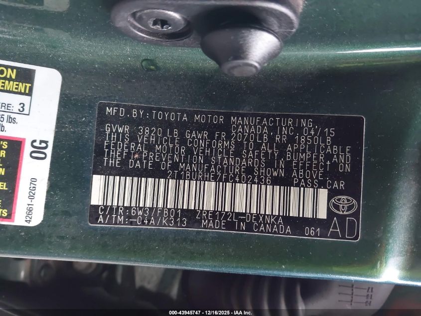 2015 TOYOTA COROLLA 2015 року Бензин, 1.8, Передний привод, vin - 2T1BURHE7FC402436 из США