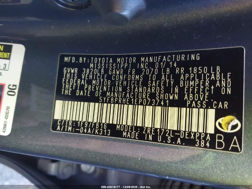 2014 TOYOTA COROLLA 2014 року Бензин, 1.8, Передний привод, vin - 5YFBPRHE1EP073741 из США