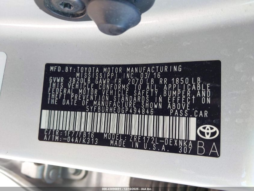 2016 TOYOTA COROLLA 2016 року Бензин, 1.8, Передний привод, vin - 5YFBURHE0GP494846 из США