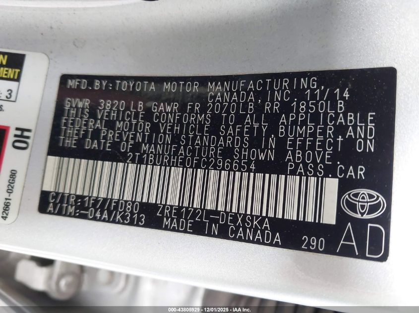 2015 TOYOTA COROLLA 2015 року Бензин, 1.8, Передний привод, vin - 2T1BURHE0FC296654 из США