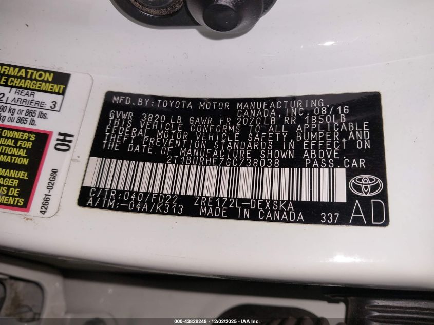 2016 TOYOTA COROLLA 2016 року Бензин, 1.8, Передний привод, vin - 2T1BURHE7GC738038 из США
