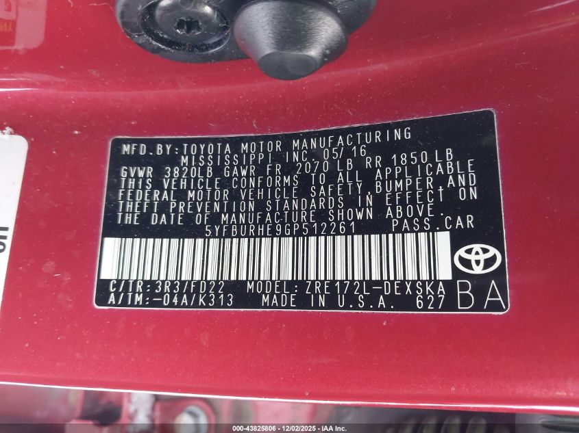 2016 TOYOTA COROLLA 2016 року Бензин, 1.8, Передний привод, vin - 5YFBURHE9GP512261 из США