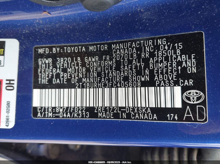 2015 TOYOTA COROLLA 2015 року Бензин, 1.8, Передний привод, vin - 2T1BURHE3FC405608 из США