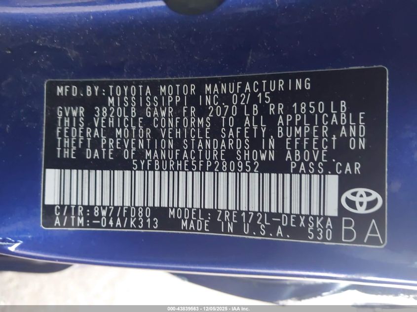 2015 TOYOTA COROLLA 2015 року Бензин, 1.8, Передний привод, vin - 5YFBURHE5FP280952 из США