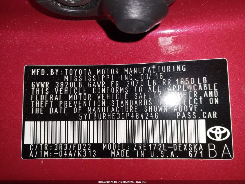 2016 TOYOTA COROLLA 2016 року Бензин, 1.8, Передний привод, vin - 5YFBURHE3GP484246 из США