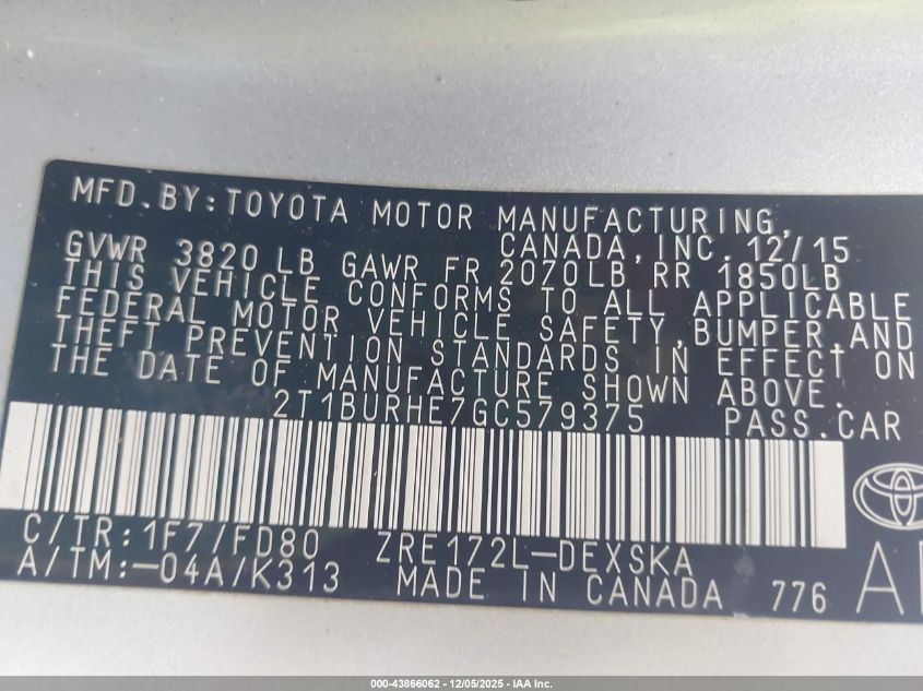 2016 TOYOTA COROLLA 2016 року Бензин, 1.8, Передний привод, vin - 2T1BURHE7GC579375 из США