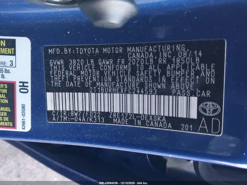 2015 TOYOTA COROLLA 2015 року Бензин, 1.8, Передний привод, vin - 2T1BURHEXFC244593 из США
