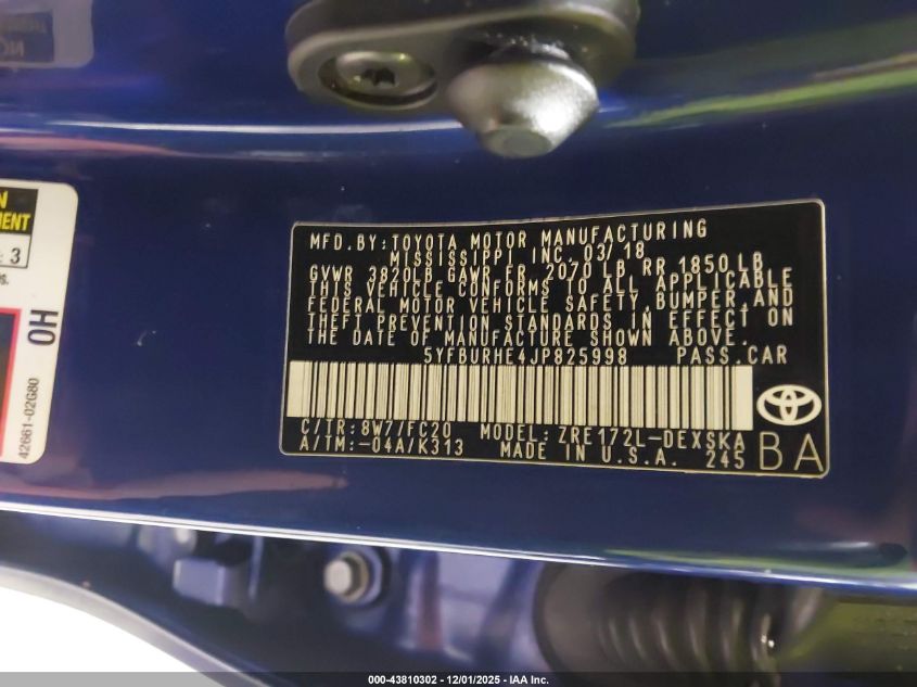 2018 TOYOTA COROLLA 2018 року Бензин, 1.8, Передний привод, vin - 5YFBURHE4JP825998 из США