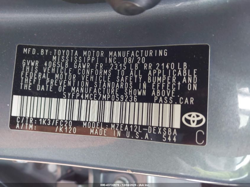 2021 TOYOTA COROLLA 2021 року Бензин, 2.0, Передний привод, vin - 5YFP4MCE7MP059236 из США